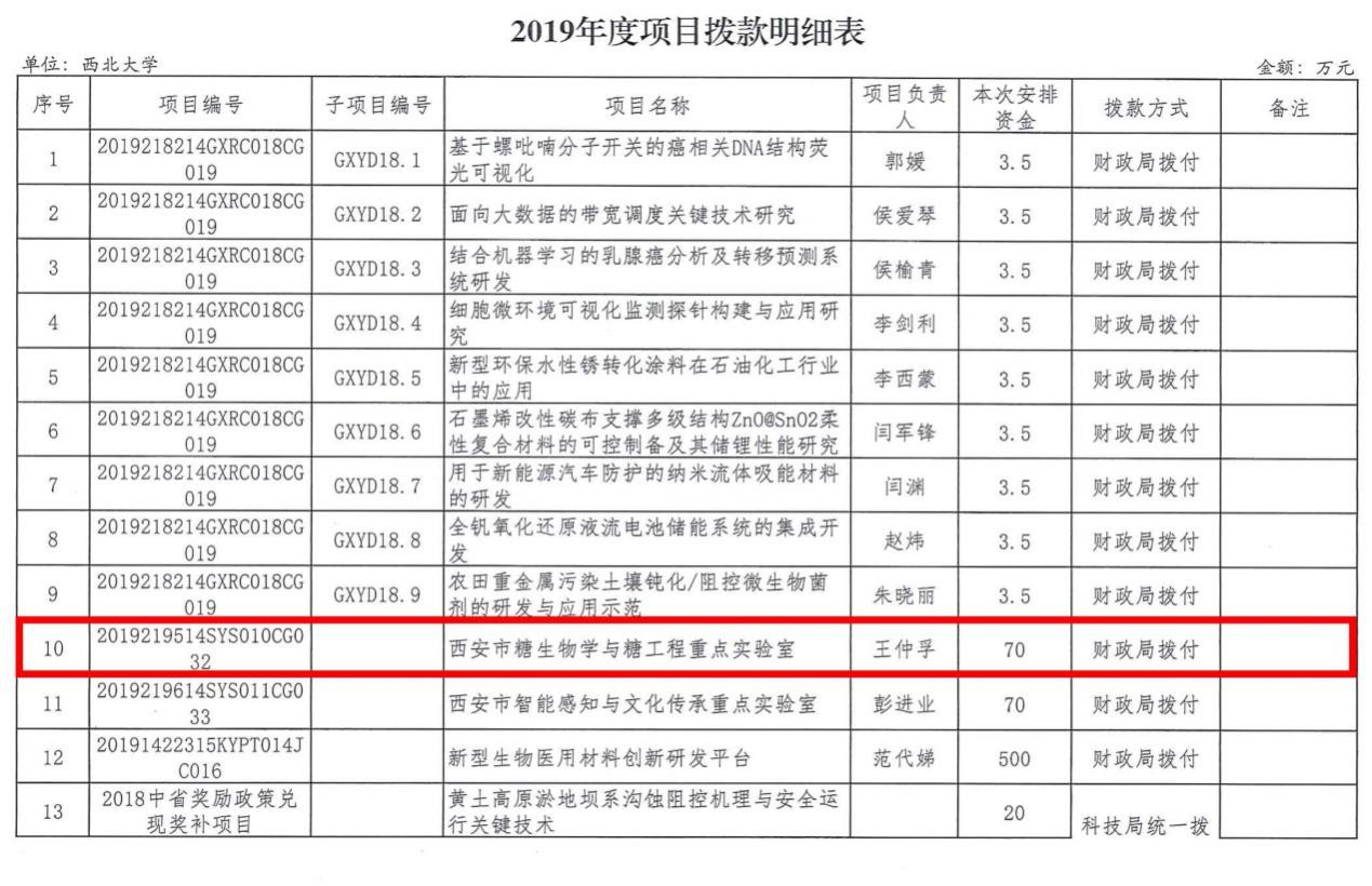 近日,西安市科技局、财政局发布《关于下达2019年西安市第一、二、四批科技计划项目的通知》,红足官网王仲孚教授负责申报的西安市糖生物学与糖工程重点实验室获批立项建设,这是红足官网科研平台建设的又一个重要进展。