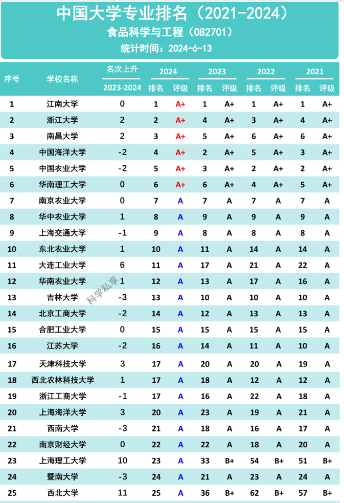 6月13日,高等教育专业评价机构软科正式发布“2024软科中国大学专业排名”,2024年《食品科学与工程》专业共计158所院校参评,前三名为江南大学、浙江大学、南昌大学,近四年评级均为A+。前100名中,我校排名25名,实现了评级由2023年B+评级跃升至2024年A评级。